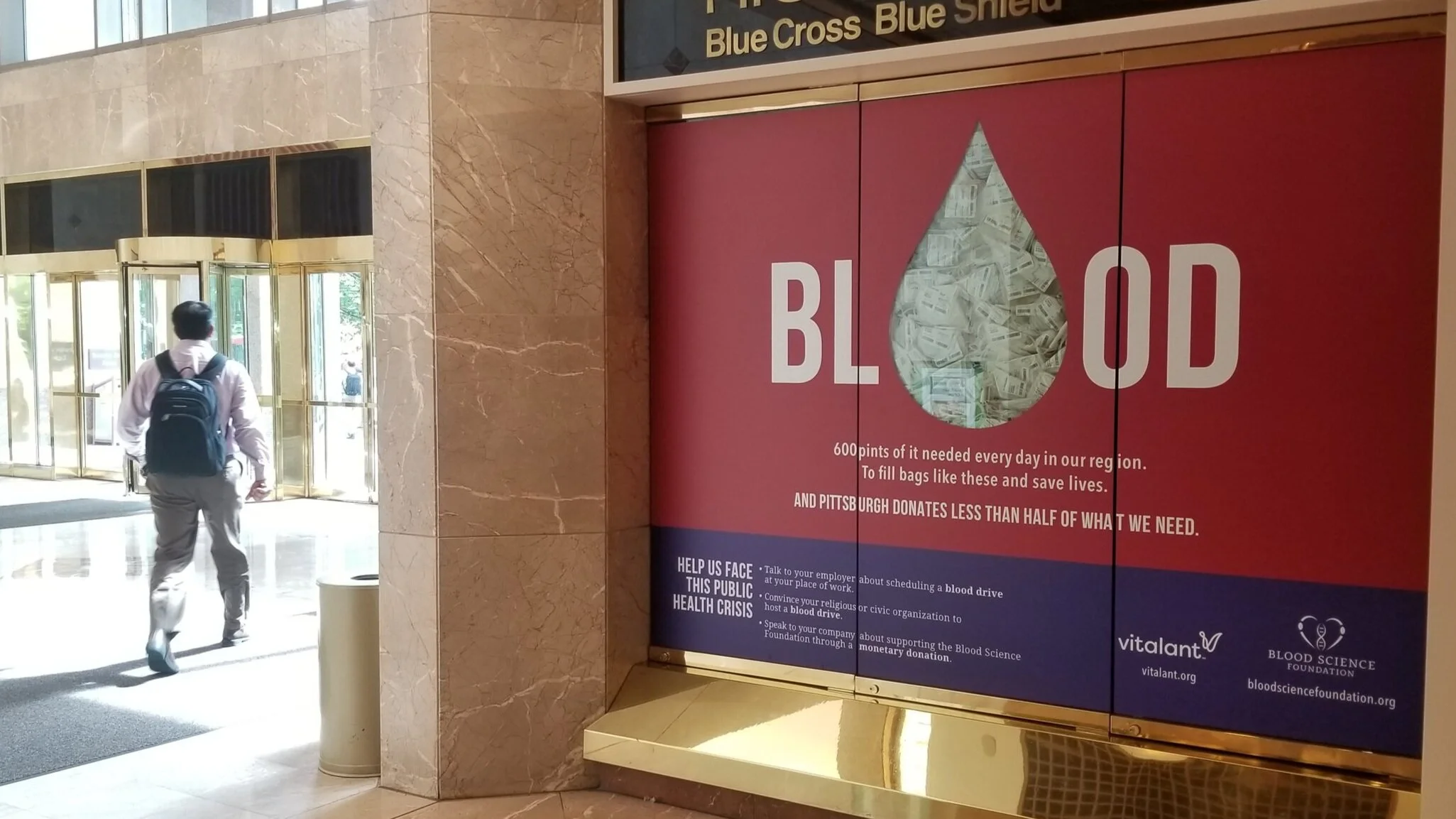 As part of our awareness push, I filled a window display in one of the biggest and busiest office buildings in downtown Pittsburgh with empty blood bags.